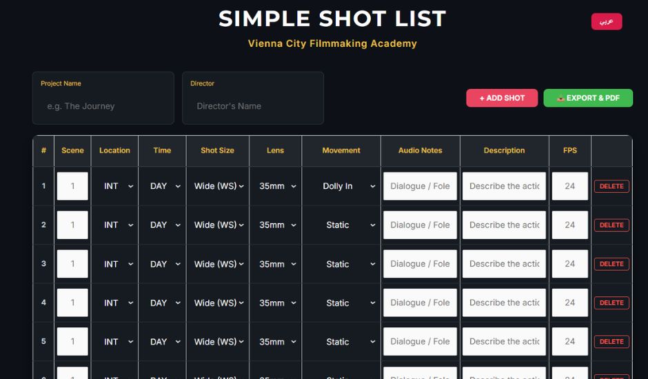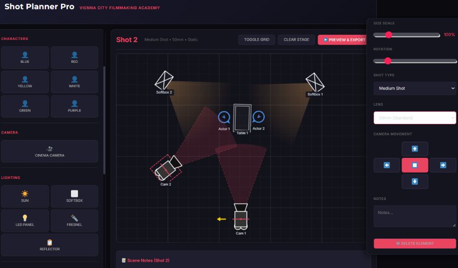 Stop wrestling with scattered notes and complex software. Welcome to the VCFA Production Suite — your all-in-one ecosystem for cinematic pre-production. Whether you are building an exhaustive shot list, designing a dynamic storyboard, plotting complex camera movements, or developing deep character profiles, our proprietary tools are built by filmmakers, for filmmakers. Plan smarter. Shoot faster. Direct with confidence.
